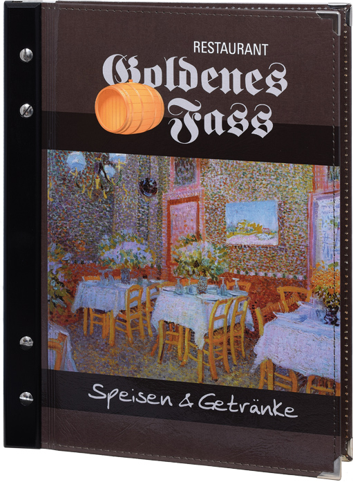 Speisekartenmappe aus verstärktem folienkaschiertem Karton.