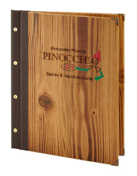 Umschlagseiten aus Furnierholz mit Außenmaserung.
